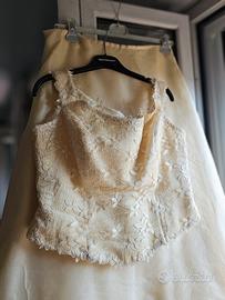 Da sposa, ampia gonna liscia sul davanti e arricciato con fiori e bottoncini sul retro, e corpetto con delicato pizzo a foglioline, scollo omerale, sul retro bottoncini, colore avorio.