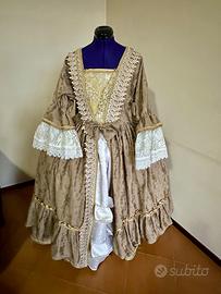 Vestito di carnevale da dama del 700 fatto completamente a mano. Composto da 3 pezzi: gonnellone, parte superiore e borsetta abbinata. Misure: vita: 100 cm. Lunghezza da terra alla vita: 97 cm. Seno: 102 cm. Circonferenza manica 45 cm. Taglia 48/50. Tessuto broccato. No cerniera, si indossa infilandolo dall’alto. andrebbe indossato con una gabbia sotto NON INCLUSA NEL PREZZO.