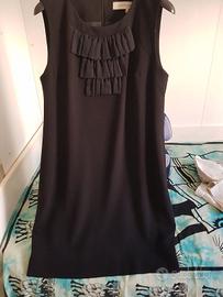 abito nero con maniche corte, scollo tondo, tagliato in vita, con due fiocchetti e due piegoline arricciate; cerniera dietro fino in vita; marca MARELLA; taglia 48 EURO 15