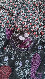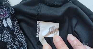 Abitino Massimo Rebecchi originale made in Italy, in tessuto a fantasia su fondo nero, leggero, semitrasparente con fodera. 100% viscosa. Taglia 40 Italia lunghezza totale spalla fondo cm 80, ampiezza cm 54.