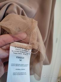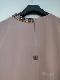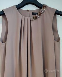 Grazioso abitino originale Twin Set color tortora. Ha una forma a sacchetto con lavorazione in pietre e paillettes sul collo e logo sulla schiena. Foderato in tulle. Tg M (veste tranquillamente fino ad una tg 44). Lunghezza abito 96 cm, larghezza circa 45 cm (da ascella ad ascella).