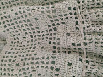La particolarità è nella raffinata lavorazione: il motivo a rete è arricchito da fiori grandi e piccoli realizzati a mano all’uncinetto, che rendono l’abito ancora più prezioso. Perfetto per cerimonie, servizi fotografici, occasioni speciali o semplicemente per chi ama l'artigianato autentico.