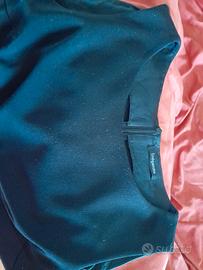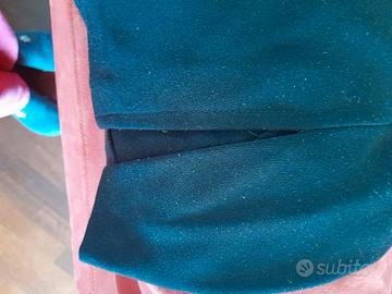 Abitino vintage TG 42 senza maniche nero di poliestere (65%), viscosa (32%) e elastan (3%) foderato (100% acetato) solo all'altezza dello scollo e giro manica. Marca Sinequanone. In vita ha una cintura con fibbia sul davanti ad incastro e sul retro intervallata da 6 cm di elastico alto quanto la cintura. Sul davanti la cucitura di sinistra lascia l'apertura per uno spacco profondo 16 cm. Le pence del seno sono lunghe 10 cm. Altro spacco, profondo 18 cm, è presente centralmente, sul retro. Dalla spalla al fine gonna misura 95 cm. Il giro vita misura 80cm e il hutk bayiche 100cm. La cintura è fermata lateralmente da due passanti di filo nero, in uno dei due il filo si è lasciato un po' andare (possono essere tranquillamente eliminati). L'interno è felpato.
