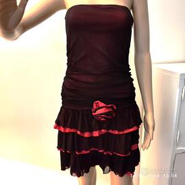 Vendo abito senza spalle, marca Fi- Filles de Paris originale, made in France, acquistato a Parigi, usato una volta, come nuovo. L’abito è in tessuto misto, colore rosso e nero, a tre balze, ha una rosa sul davanti, ed il busto elasticizzato con una zip laterale di cm 26.; ottime rifiniture, morbido, leggero, veste le taglie 42/44. Misure in cm: petto 32, lunghezza 70. Vero affare.