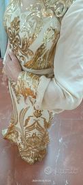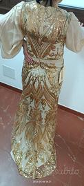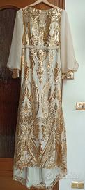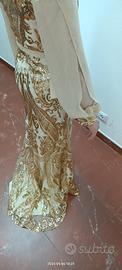 Abito a sirena da cerimonia colore Champagne con lavorazione paillettes d'orate. Tg. S Misure: Circonf. Seno 82. Circonf. Vita cm. 76. Circonf. fianchi cm. 86. Dalla fossetta del giugulo a terra cm. 133. Altezza dav. dalla testa ai piedi cm. 159. NUOVO!!! Ancora con cartellino... Purtroppo "svendo" per errato Colore! Occasionissima!!!