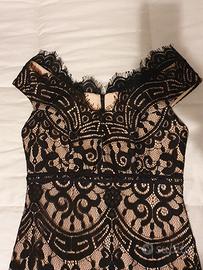 Abito da cerimonia, a sirena. Ottima vestibilità. Il pizzo nero con il fondo color nude lo rende perfetto sia per il giorno che per la sera.