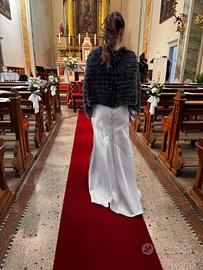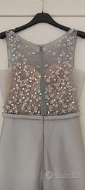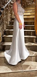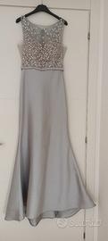 Abito a sirena elegante con corpetto gioiello, per cerimonie importanti . Più guanti lunghi colore argento