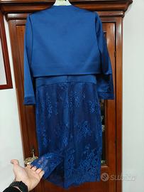 Abito a tubino di raso, con decorazioni sulla gonna e sulle maniche. Leggero spacco al centro della gonna e decorazioni in strass in vita.Taglia 46, ottime condizioni, utilizzato una sola volta. Incluso spolverino color blu in raso. Made in Italy, abito acquistato in boutique.