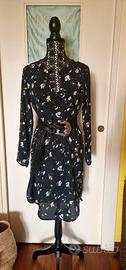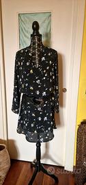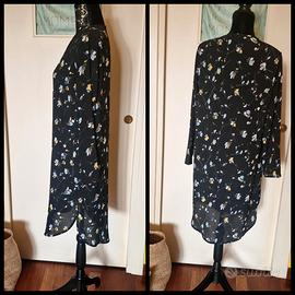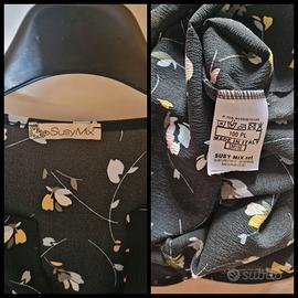 Abito SusyMix in crepe di viscosa. Tg S/M, vestibilità over. Fondo nero con una delicata fantasia floreale in toni multicolor pastello. Modello a tunica con orlo stondato, profonda scollatura. Abito super comodo, perfetto sia lasciato morbido, ma anche con una cintura in vita o sui fianchi, dando un aspetto più blusante. Condizioni perfette. Lunghezza 97 cm, da ascella ad ascella 52 cm, spalle 40 cm.