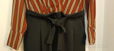 Comodissimo abito tuta per tutte le occasioni, grazie al tessuto in viscosa può essere utilizzata tutto l' anno. Marca Eco. Veste una 42 comoda, il pantalone con pence è di colore nero e la parte superiore a righe è di colore beige, marrone bruciato e nero, in vita oltre alla presenza di un bottone e di una lampo'è una comoda cintina in tessuto.