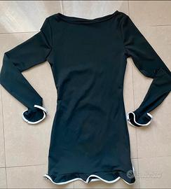 Un vestito nero elegante con maniche lunghe, dettagli ondulati bianchi sui polsini e sull'orlo, sopra il ginocchio per un tocco fresco e sofisticato. Perfetto per occasioni informali chic!