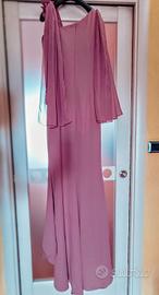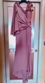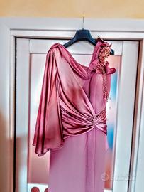 ABITO DI ALTA SARTORIA. Abito lungo modello "sirena" in splendido rosa antico, tessuto in cotone italiano fine. Spalla sinistra nuda, con manica destra aperta in raso cadente. Impreziosito con un fiore e pietre cadenti a renderlo unico ed elegantemente fine. Disegnato e confezionato in alta sartoria. Abito elegante ed estremamente fine. Taglia 44. Spedizione da concordare a carico dell'acquirente. No perditempo.