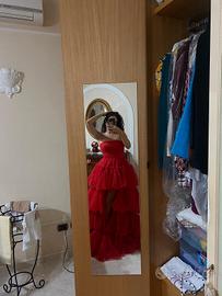 Abito ampio utilizzato solo ed esclusivamente una volta in occasione del mio 18. È rosso e leggermente brillantinato, corto avanti e lungo indietro tutto in tulle. Il corpetto ha già le coppette preformate. Tenendolo appeso tutto il tulle si risistema. La chiusura è a zip è il corsetto si stringe e allarga con i laccetti