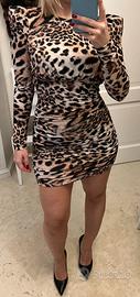 Mini abito a tubino stretto a girocollo con maniche lunghe. Fantasia maculata con spallina pronunciata e drappeggio nella minigonna. Tg.42