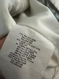 Tessuto jacquard floreale argento, realizzato con un mix di fibre che conferisce al capo una lucentezza discreta.
