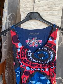 Abito asimmetrico smanicato, con scollo rotondo che termina con V centrale.