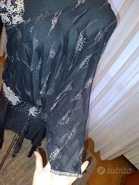 Vendo bellissimo abito da ballo danze latino americane nero con motivi floreali bianchi e brillantini con riflessi viola. Veste taglia 46-48.