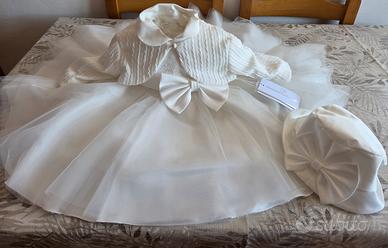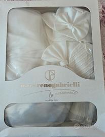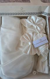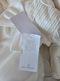 Marca Nazareno Gabrielli,4 pezzi,vestito con strascico con manica a giro aperto dietro con lampo,realizzato con un telo di raso e pizzo Macramè,4 teli di tulle sul fondo,camicia a manica lunga realizzata in Popeline di cotone,bolerino realizzato in Jersey Jacquard,cappello in raso. Prodotto artigianale Made in Italy