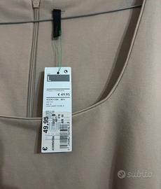 Ha maniche corte, colore beige, inserto con striscia nera che nasconde la pancia. Modello con tessuto elsticizzato.
