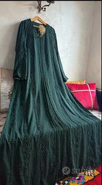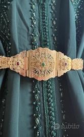 Takchita elegante e raffinata, colore verde intenso con ricami preziosi e dettagli luminosi tono su tono. Modello fluido e slanciato, completa di cintura dorata che valorizza la vita. Veste comodamente dalla S alla XL. Ideale per cerimonie, matrimoni, feste tradizionali ed eventi speciali. In ottime condizioni, indossato 1 volta. Prezzo trattabile
