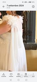 Usato due volte,disponibile ad inviare altre foto,la stola è stata cucita alle bratelle del vestito ad effetto mantellina, nell'attacatura di questa mantellina sono state applicate delle spille con piume removibili, la parte trasparente del seno è stata foderata per essere meno trasparente...molto fine e luccicoso...dietro ha l'elastico e laterale ha la cerniera, adattabile come misura a L, XL, XXL.