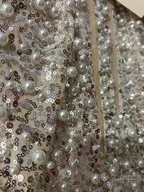 Stupendo vestito corto color bianco/avorio decorato con paillettes luminose su tutta la superficie e arricchito da piume leggere sulla parte inferiore, per un effetto elegante e scenografico.