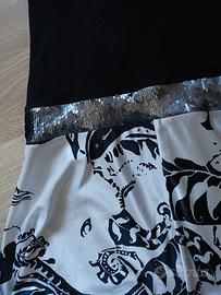 Vendo abito elegantino bicolor, con cirpino in jersey con scollatura lievemente a goccia e gonna asimmetrica a fantasia, con fascia in paillettes fra corpino e gonna, marca Nemo, lunghezza midi, taglia III. Foderato