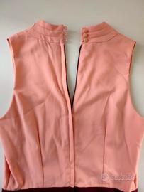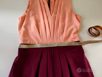 Abito lunghezza al ginocchio, senza maniche con pieghe plissé. Scollo a V e cerniera nascosta dietro con bottoni decorativi. Foderato. Silhouette non aderente, modello leggermente a tubino Colore Rosa antico e melanzana
