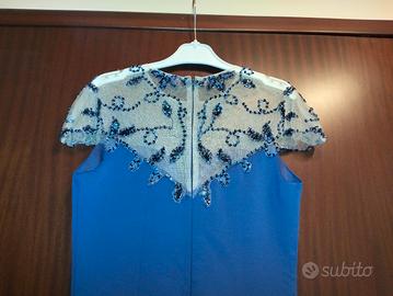 vendo nuovissimo abito blu con ricami da cerimonia per donna. usato solo una volta. taglia 44 ristretto in sartoria fino a taglia 42