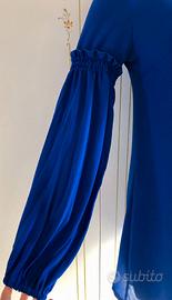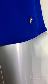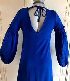 Abito fluido blu elettrico, lunghezza a metà coscia, foderato, scollo a V sul retro regolabile, maniche lunghe eleganti e operate. Veste una S ma senza aderire. Sull'orlo ha un'applicazione gioiello, una F in oro con strass. Leggero e sbarazzino, fa sentire chic senza alcuno sforzo. Mai indossato, non ha alcun segno di usura.