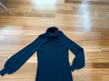 TAGLIA 42, COLORE BLU SCURO, TUTTO IN MORBIDISSIMO CASHMERE ELASTICIZZATO, MANICHE LUNGHE A PALLONCINO, LUNGHEZZA ABITO ESCLUSO COLLO CM 90, SUL RETRO MEDAGLIETTA DORATA CON SCRITTO BLUGIRL FOLIES, ABITO RAFFINATO E DI ALTA QUALITA'.