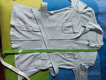 Completo abito da donna Nicoletta Ruggero, gonna e blusa maniche lunghe con cerniera e cintura. Morbido e leggero, colore chiaro, azzurro ghiaccio, usato una volta.