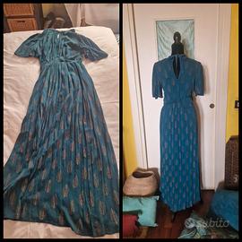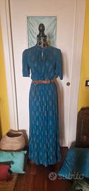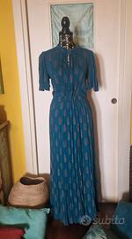 Bellissimo abito Wild Pony in stile boho chic. In crepe di viscosa colore ottanio con stampa a foglia dorata. Tg XS dalla vestibilità comoda, quindi è perfetto anche per una S. Mezze maniche a sbuffo e linea a farfalla, scollo a lupetto con dettaglio cut out, allacciatura con fusciacca dietro al collo e lieve scollatura a goccia, vita con elastico. L'abito è meraviglioso ed indossato pochissimo, ha una minuscola fallatura vicino allo scollo sul davanti, evidenziata nella foto allegata, ma grazie alla trama goffrata del tessuto, è davvero invisibile. Lunghezza 145 cm, da ascella ad ascella 47 cm, spalle 40 cm vita da min 34 a max 40 cm.