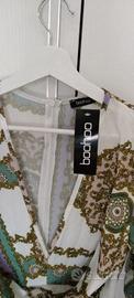 Abito con cartellino, mai usato, tessuto leggero e fluido. Zip alla schiena x chiusura. Taglia 14 sull'etichetta, ho controllato che corrisponde a una XL in UK ma secondo me va bene x S oppure M. Indosso a me rimane morbido, io porto una s.