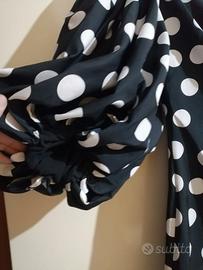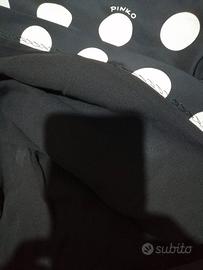 Abito corto Pinko tg 44 italiana. Prezzo ribassato e non trattabile!!! Tessuto taffeta nero con pois bianchi. Veste aderente e il tessuto è fermo, non elastico. Foderato in maglina. Chiude con cerniera dietro. Nuovo con cartellino, comprato per un evento e mai indossato per cambio outfit. Verificare le misure e chiedere altre informazioni in merito ad abito. Non accetto reso. Misure Da ascella ad ascella 43 Vita 37 Manica 40 lunghezza 81