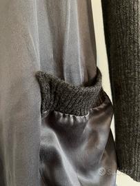 Abito Caractere, modello in doppio tessuto: corpo in seta 100%, maniche, collo e bordi in maglia 20% cachemire, 30% mohair, 50% poliammide. Colore grigio scuro con effetto diverso per i due tessuti. Linea dritta, con grande collo ad anello, due tasche laterali con bordo in maglia e bordo al fondo in maglia. Attaccatura delle maniche in voile di seta, non si sgualcisce. Molto bello e comodo. Ottime condizioni. Misure: lunghezza 98 cm, ascelle 51 cm.