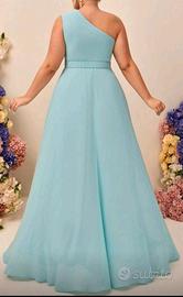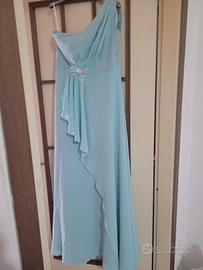 Abito da cerimonia in chiffon Monospalla Color Tiffany Elastico sotto seno sul retro applicazione in 3d floreale NUOVO CON CARTELLINO !