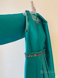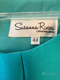 Abito per cerimonia. Nuovo con cartellino SUSANNA RIVIERI. Color verde acqua in tessuto Mikado. Corto fino alle ginocchia e completo di stola. Cintura in Swarovski cucita in vita.