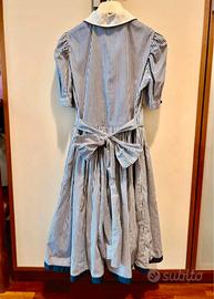 Abito bambina Magil, bianco rigato blu, colletto bianco, abbottonatura centrale e fiocco regolabile. In cotone 100%, rivestito internamente e con sottogonna sempre in cotone, adatto anche per cerimonie.