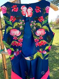 Abito da cerimonia lungo floreale colore blu e fiori color corallo, scollo nella schiena e fascione grande in vita.