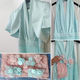 Capo di alta sartoria, ad un prezzo incredibile. Il lussuoso abito è firmato Carla Ruiz, ed è verde acqua/ azzurro turchese/tiffany con gonna a pieghe A-line in #chiffon e scollo a V all'americana in #mikado (pregiata sera giapponese più pesante della seta). Taglia 38, ma veste sia dalla S, M ed L grazie allo scollo a V e alla gonna a pieghe che si adatta ad ogni fisicità. Presente anche un bolero con collo alla coreana e manica corta taglia M dello stesso colore del corpetto in mikado dell'abito.