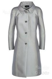 Originale abito da cerimonia marca Luisa Spagnoli composto da abito stile charleston tutto ricamato con paillettes e cintura in vita, smanicato e da cappottino abbinato in taffetà di seta con bottoni gioiello. Colore grigio. Taglia 46. Ottime condizioni di conservazione.