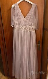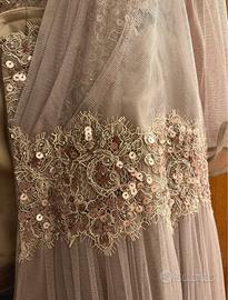 Club in tulle di seta color nude/lilla con applicazioni di pizzo e paillettes . Stola inclusa. L'orlo ha qualche imperfezione che si può correggere tranquillamente essendo a taglio vivo. Indossato una volta sola