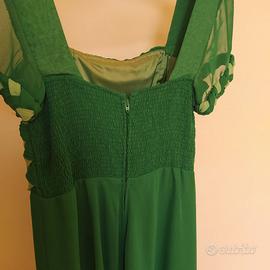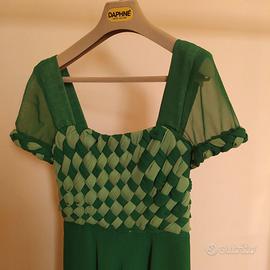 Specialissimo abito da cerimonia vintage fatto a mano -è di chiffon con intrecci di tessuto in due tonalità di verde sul bustino davanti mentre sul dietro ha lavorazione goffrata. la gonna è svasata e ha tre sottogonne di chiffon delle stesse tonalità di verde del bustino intrecciato. Ha cerniera sulla schiena e la fodera della gonna è in poliestere. E' proprio un bellissimo abito che non se ne vedono in giro. Purtroppo non ho più la taglia che avevo quando l'avevo acquistato perciò lo metto in vendita.