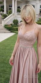 vendo meraviglioso abito lungo da cerimonia colore rosa con corpetto lavorato che si stringe nel punto vita e da li parte la gonna che scende morbida.