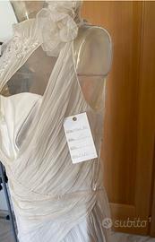 Splendido abito da cerimonia color avorio in pura seta, chiffon e pizzo ricamato a mano con perline argento