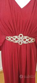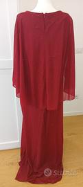 Splendido abito lungo da cerimonia color rosso borgogna, con leggero effetto glitter e mantella drappeggiata sulle spalle che crea un movimento elegante e raffinato.