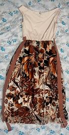 Abito lungo alla caviglia (h 132 cm), rosa nude con fantasia a fiori nella gonna leggermente in rilievo.