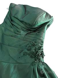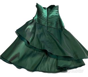 Vendo, come da foto, bellissimo abito da cerimonia longuette asimmetrico, tg. 46, color verde petrolio (lucido, cangiante fino a risultare viola) con corpetto preformato ma morbido, completo di stola e spalline removibili, fresco di pulitura a €215.