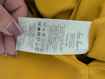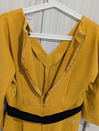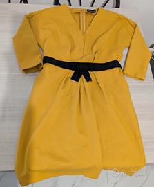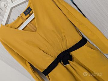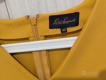 Splendido abito di alta Sartoria firmato Luisa Spagnoli, collezione Luxury 2015. Indossato una sola volta (2 ore) per un evento e conservato con estrema cura: le condizioni sono pari al nuovo. Dettagli Tecnici e Qualità: Composizione d’eccellenza: 60% Viscosa, 35% Poliammide, 5% Elastane. Tessuto Punto Milano: Si tratta di un jersey compatto di alta qualità, tipico della manifattura Made in Italy. È un tessuto "strutturato" che non segna i difetti, non si stropiccia e mantiene perfettamente la forma tutto il giorno. Colore: Un raffinato giallo senape/zafferano, luminoso e perfetto per ogni stagione. Effetto Silhouette: Il taglio sartoriale sapiente e la consistenza del Punto Milano creano un effetto modellante incredibile. La linea a trapezio unita allo scollo a V slancia immensamente la figura, allungando il collo e valorizzando il punto vita. Dettagli di stile: Maniche a 3/4 eleganti, pratiche tasche laterali invisibili e raffinata cintura in velluto nero (inclusa) che definisce la silhouette con un tocco bon-ton. Chiusura: Zip a scomparsa sul retro per una vestibilità pulita e sartoriale. Perfetto per una cerimonia o un evento formale.